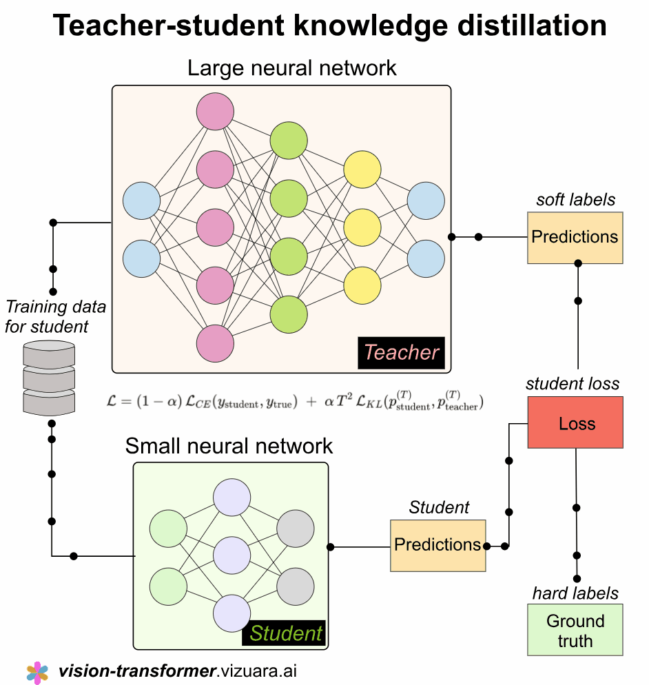 The student model, which is usually smaller, lighter, and much faster, learns from two sources at the same time, and this is an important idea because the student is not abandoned with only the hard labels but is guided by the softer and more informative probabilities of the teacher, which improves its generalization far more than standard supervised learning would.