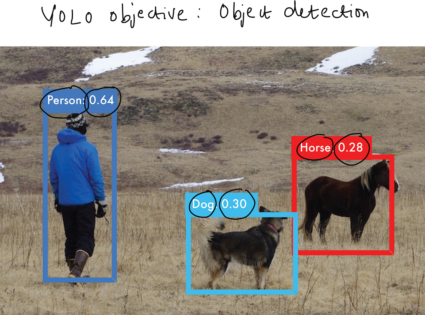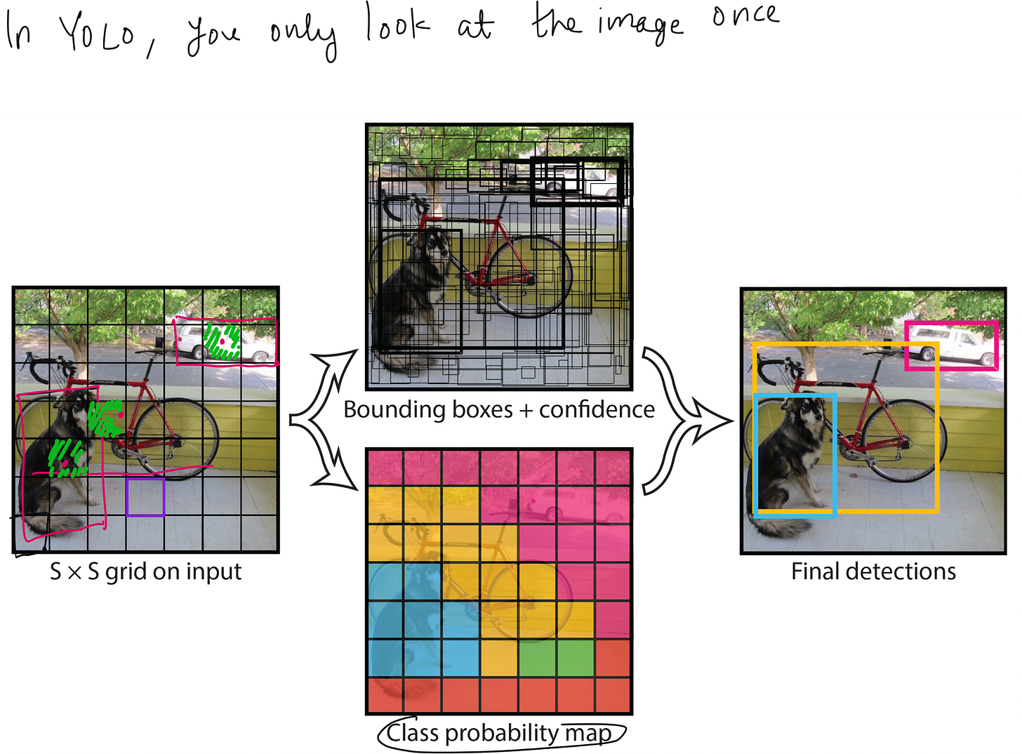 The input to YOLO is the entire image. The output is not just a single label, but a set of bounding boxes. Each bounding box is described by its center coordinates (x and y), its width and height, the class label, and a confidence score. The confidence score combines two ideas - the probability that there is an object in the bounding box and the probability that the object belongs to a particular class.