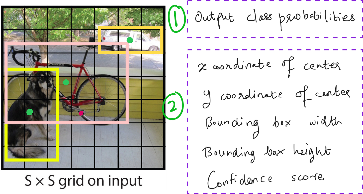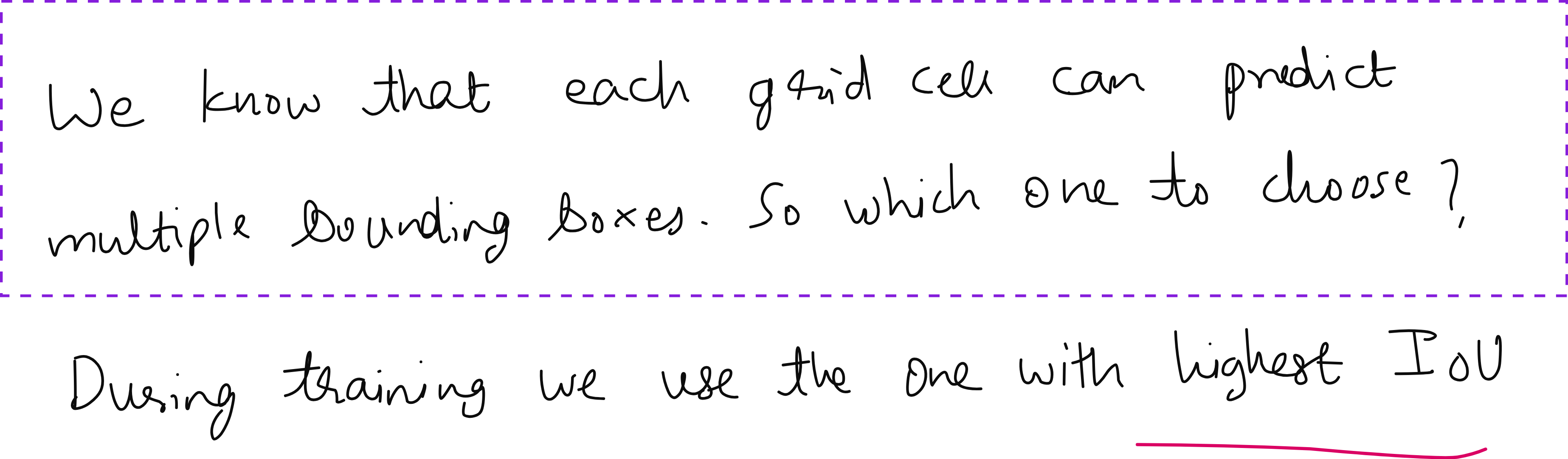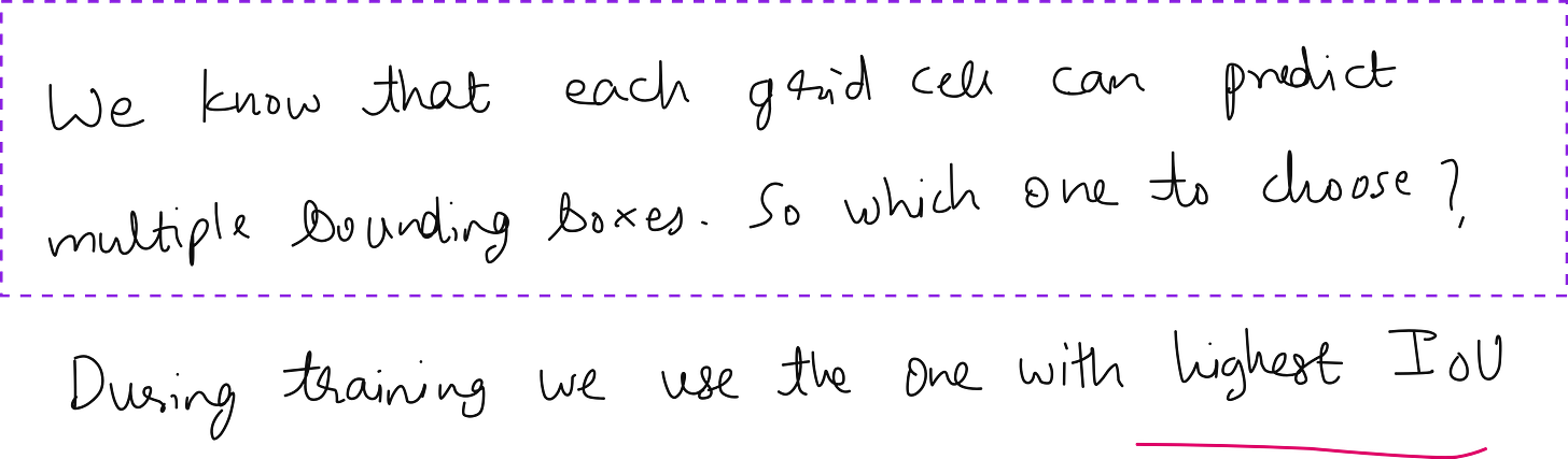 This design raises many interesting questions that often come up when teaching YOLO. For instance, what happens if two dogs are standing side by side and both fall into the same grid cell? What if an object is larger than the grid cell? Why does the bounding box sometimes appear larger than the cell itself? All of these are practical concerns, and YOLO addresses them by allowing multiple bounding boxes per cell and by learning to regress coordinates beyond the cell boundaries.