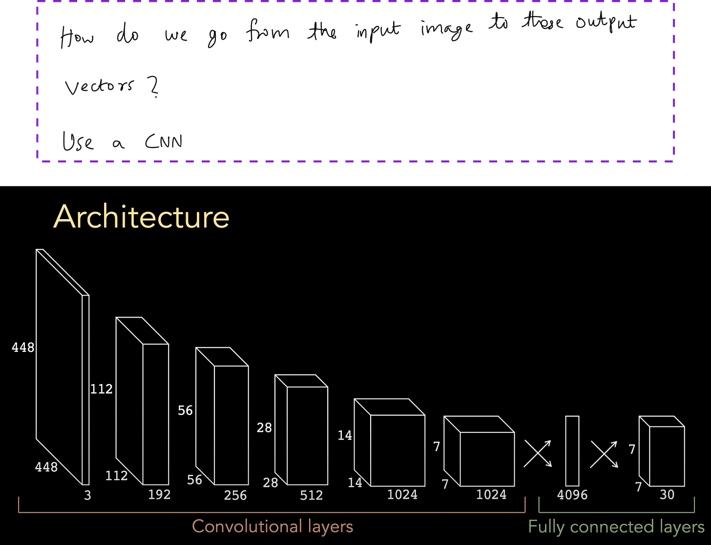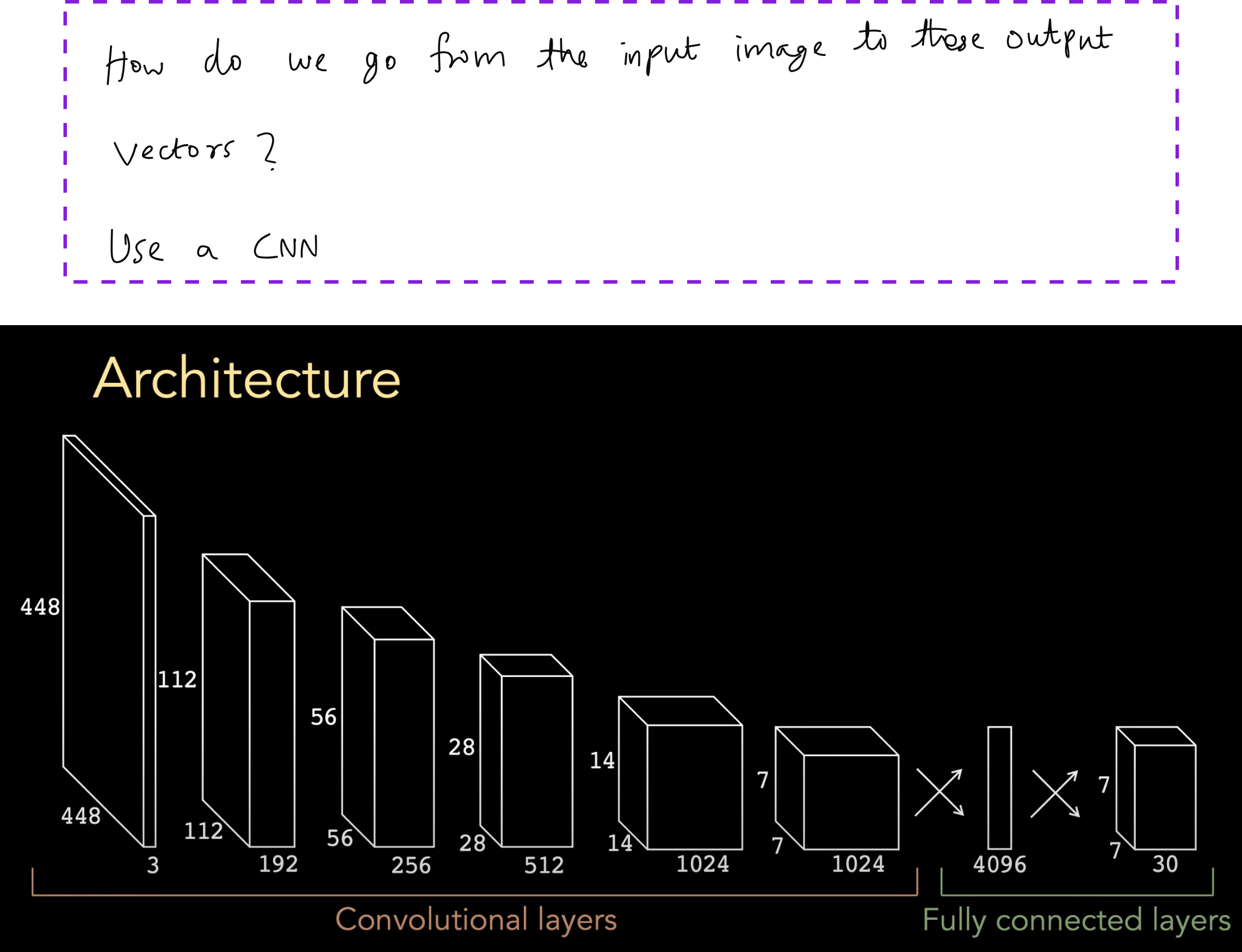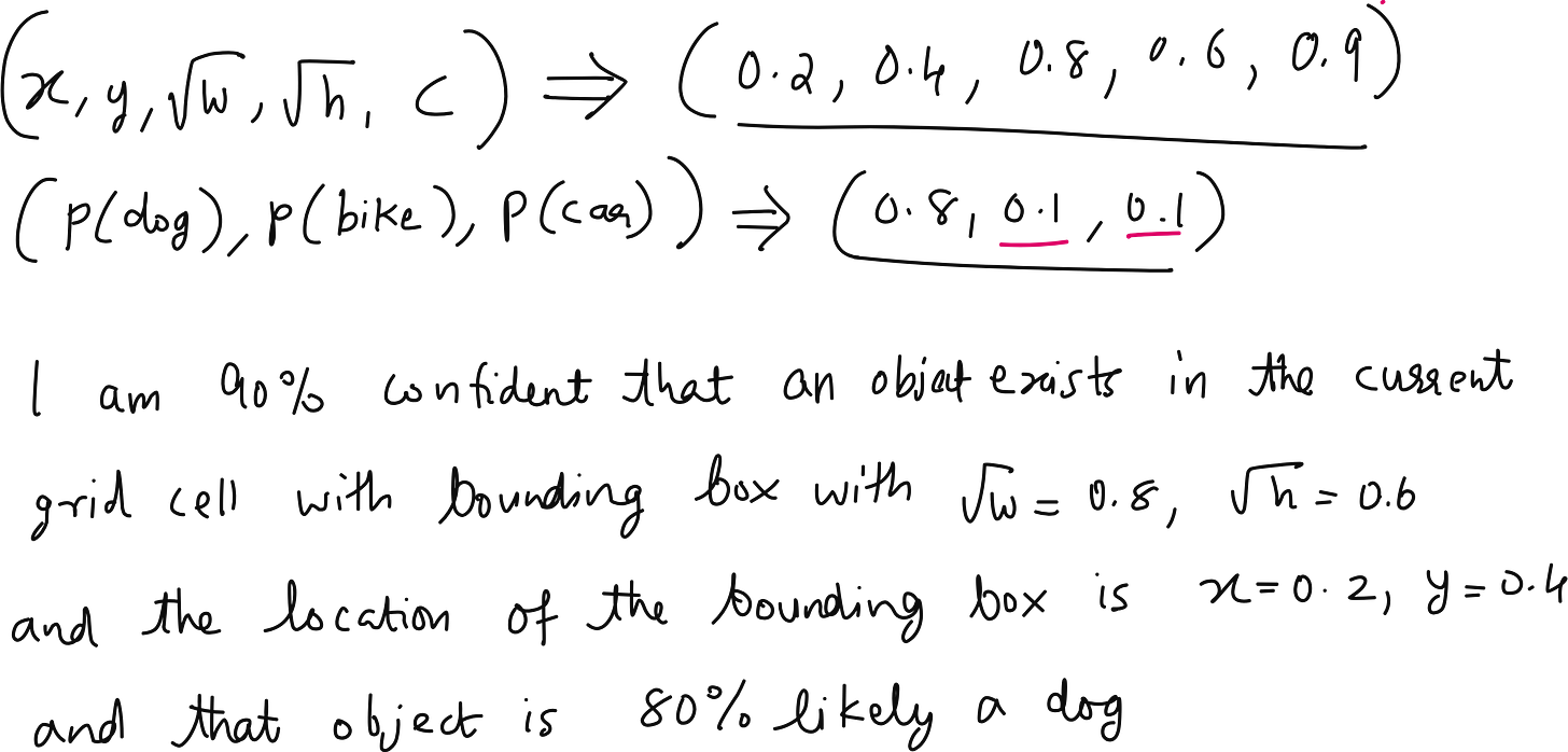Imagine taking an image and dividing it into an S × S grid. Each grid cell is responsible for detecting objects whose centers fall inside it. For each cell, the model predicts B bounding boxes. Each bounding box includes coordinates (x, y, width, height), a confidence score, and class probabilities. So the output for one grid cell looks like a set of vectors, and the entire image output becomes an S × S × (B × 5 + number of classes) tensor.